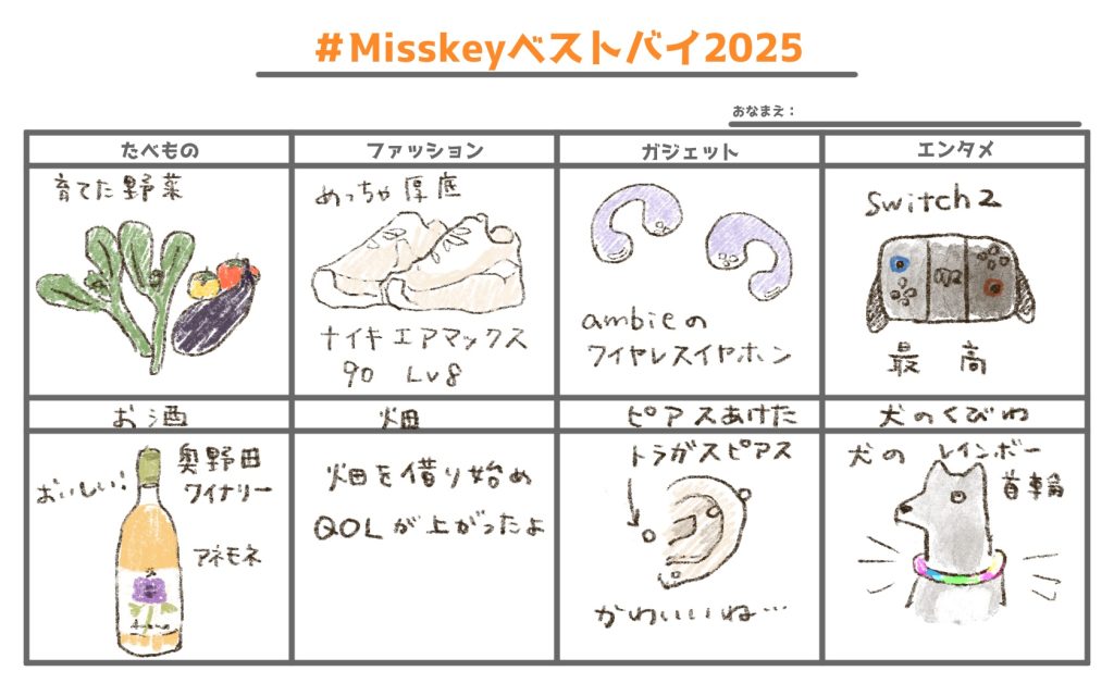 私が普段いるSNSで「いろんな人のベストバイが見たい!」という投稿と一緒にテンプレートを作ってくれていた方がいたので記入してみた。食べ物と畑は厳密に言うとベストバイではないけれど畑で野菜を育てるために色々買ったからいいかと思い含めてしまった。